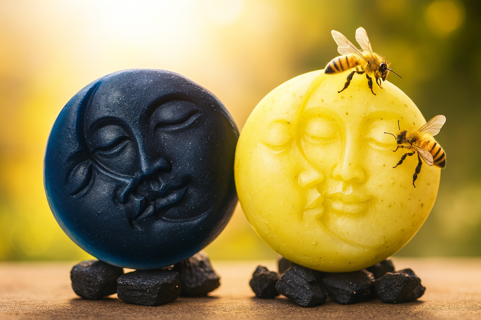 Jabón bifásico circular que combina dos fases con funciones complementarias: carbón activado para limpiar profundamente y miel con avena para calmar e hidratar la piel.