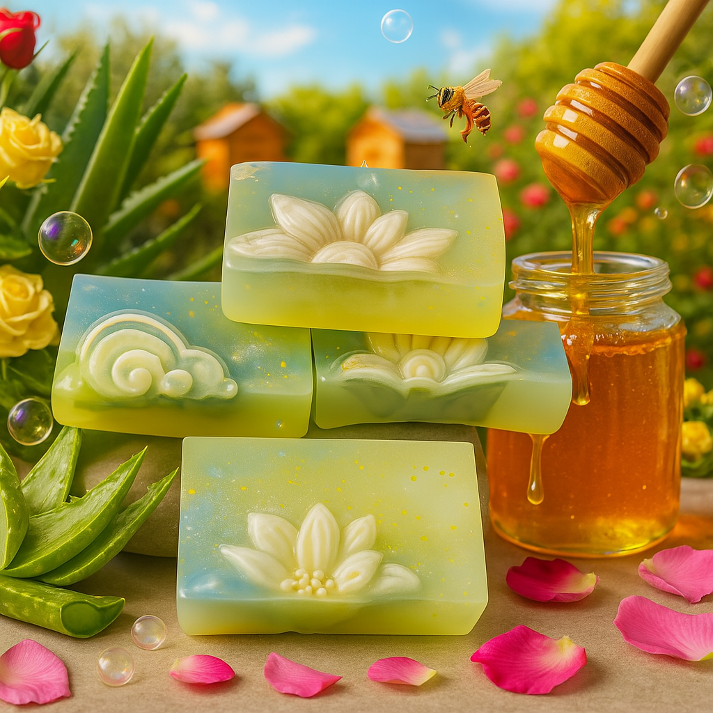Jabón nutritivo y calmante elaborado con aloe vera y miel, perfecto para una limpieza suave que hidrata, protege y regenera la piel.