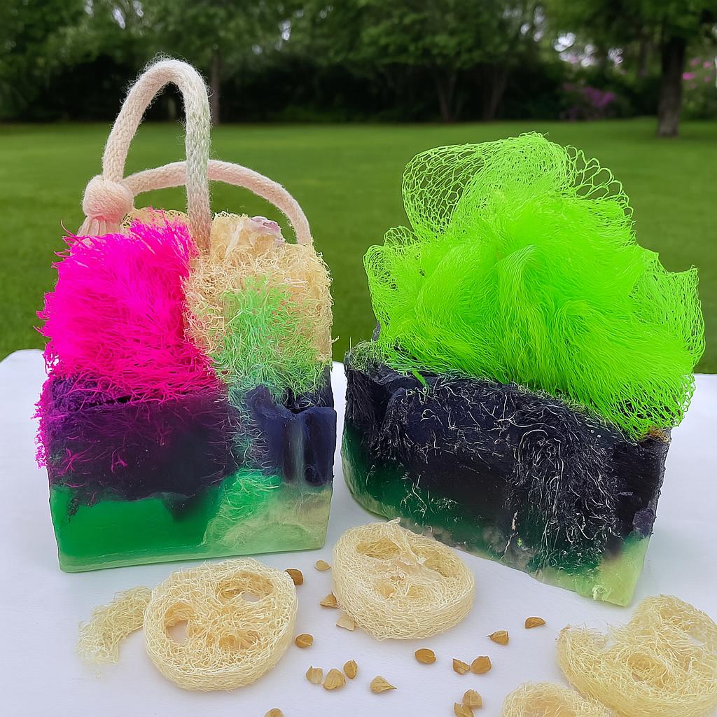 Jabón con incrustaciones de lufa natural, ideal para una limpieza profunda y exfoliación suave del cuerpo.