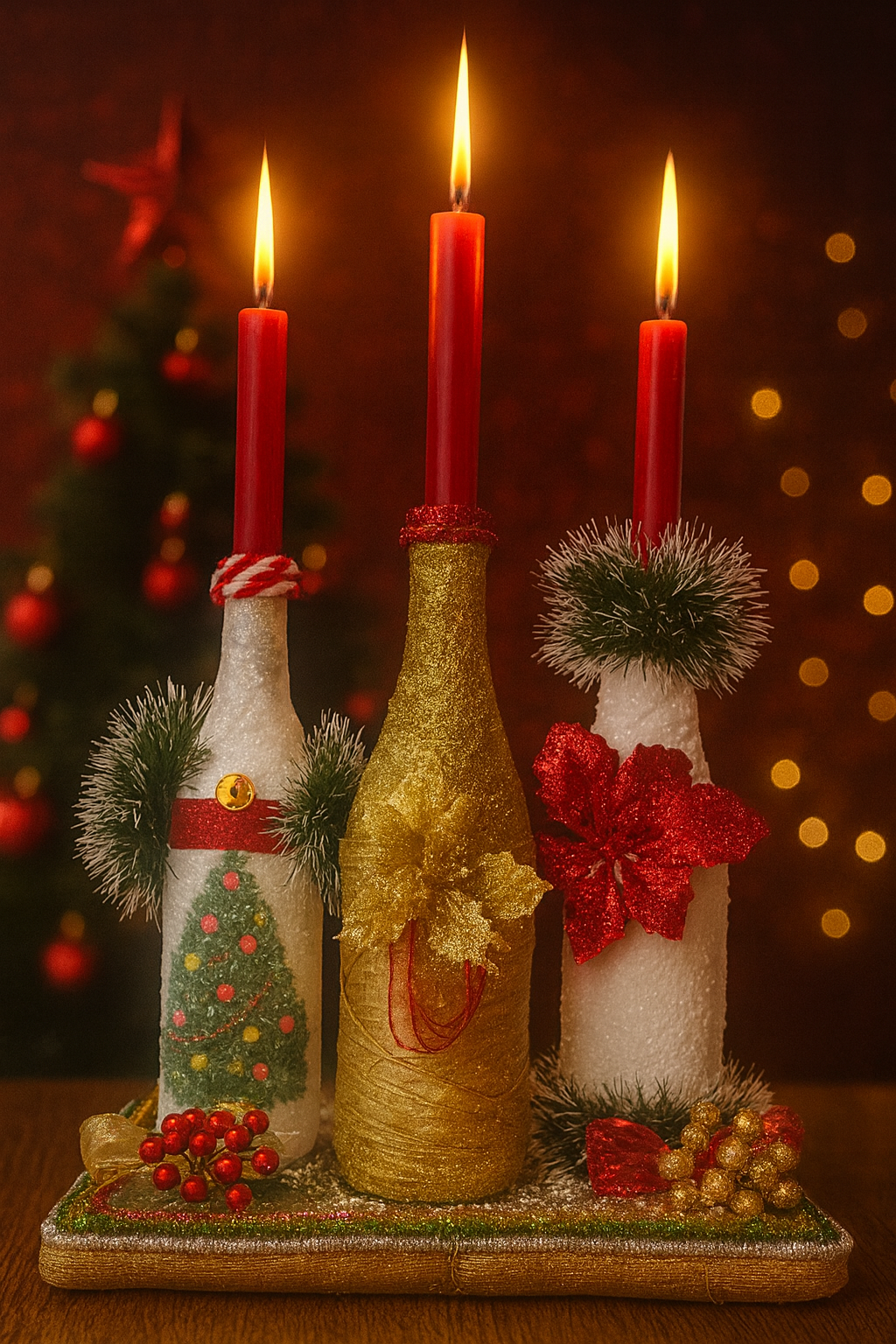 Este portavelas está elaborado artesanalmente a partir de botellas recicladas, transformadas con dedicación en una pieza decorativa ideal para ambientar tu hogar durante la Navidad.