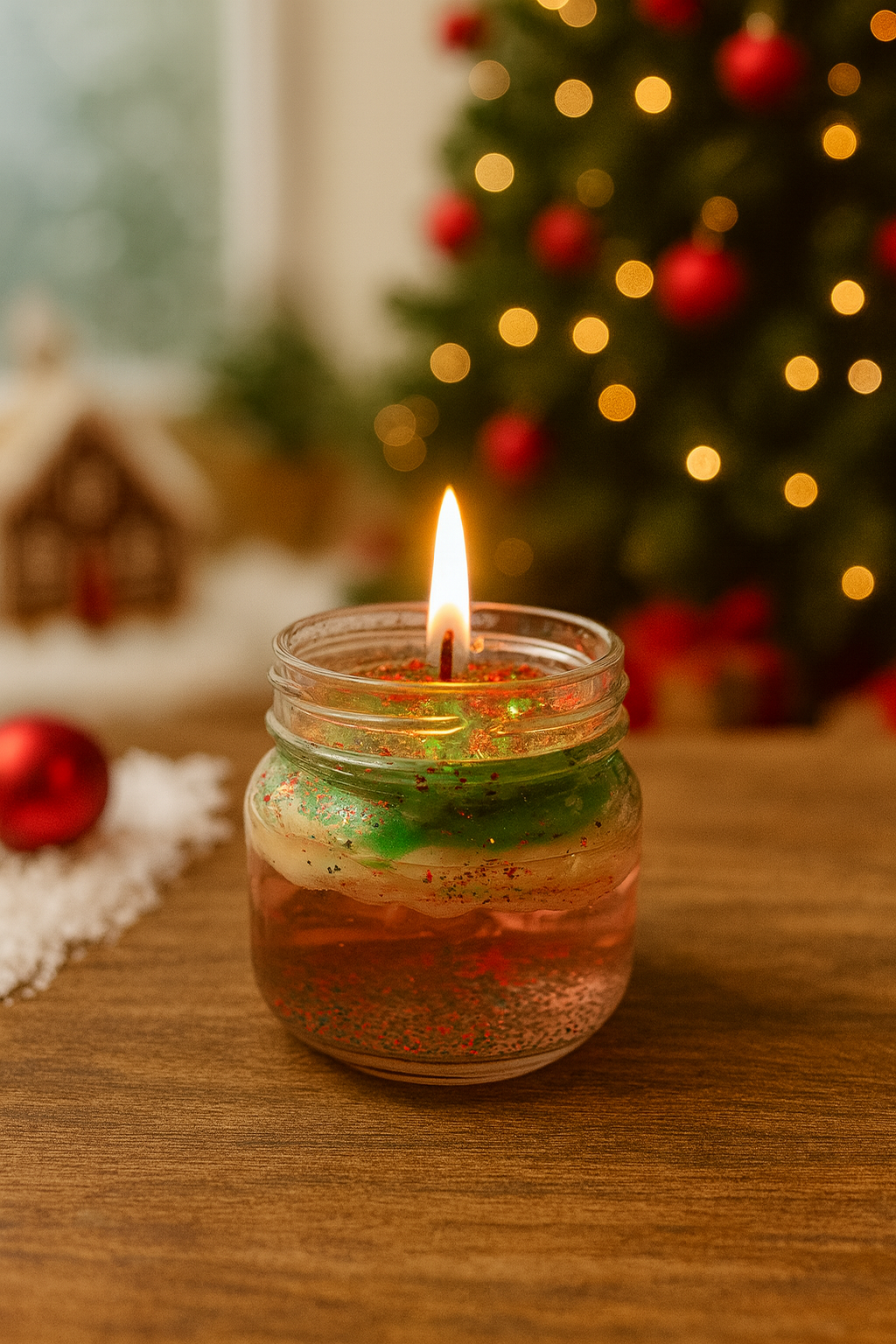 Esta vela combina una base líquida decorada con glitter flotante y una sección superior sólida que se enciende como una vela tradicional. Su aroma delicado y su apariencia brillante la convierten en una pieza ideal para crear ambientes relajantes, mágicos o festivos.