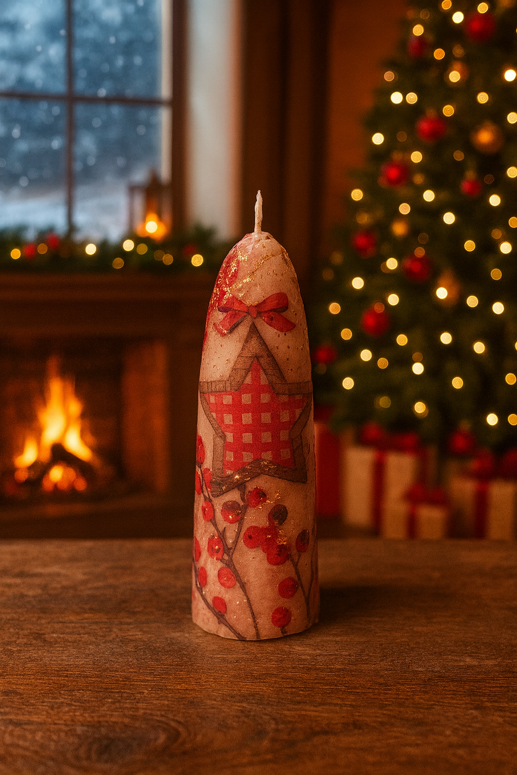 Coloca la vela sobre una base estable y resistente al calor. Pueden encenderse para aportar luz y calidez a la decoración navideña, o mantenerse apagadas como parte del adorno. Para preservar los detalles, evita encenderlas si prefieres conservar intactas las imágenes o el glitter.